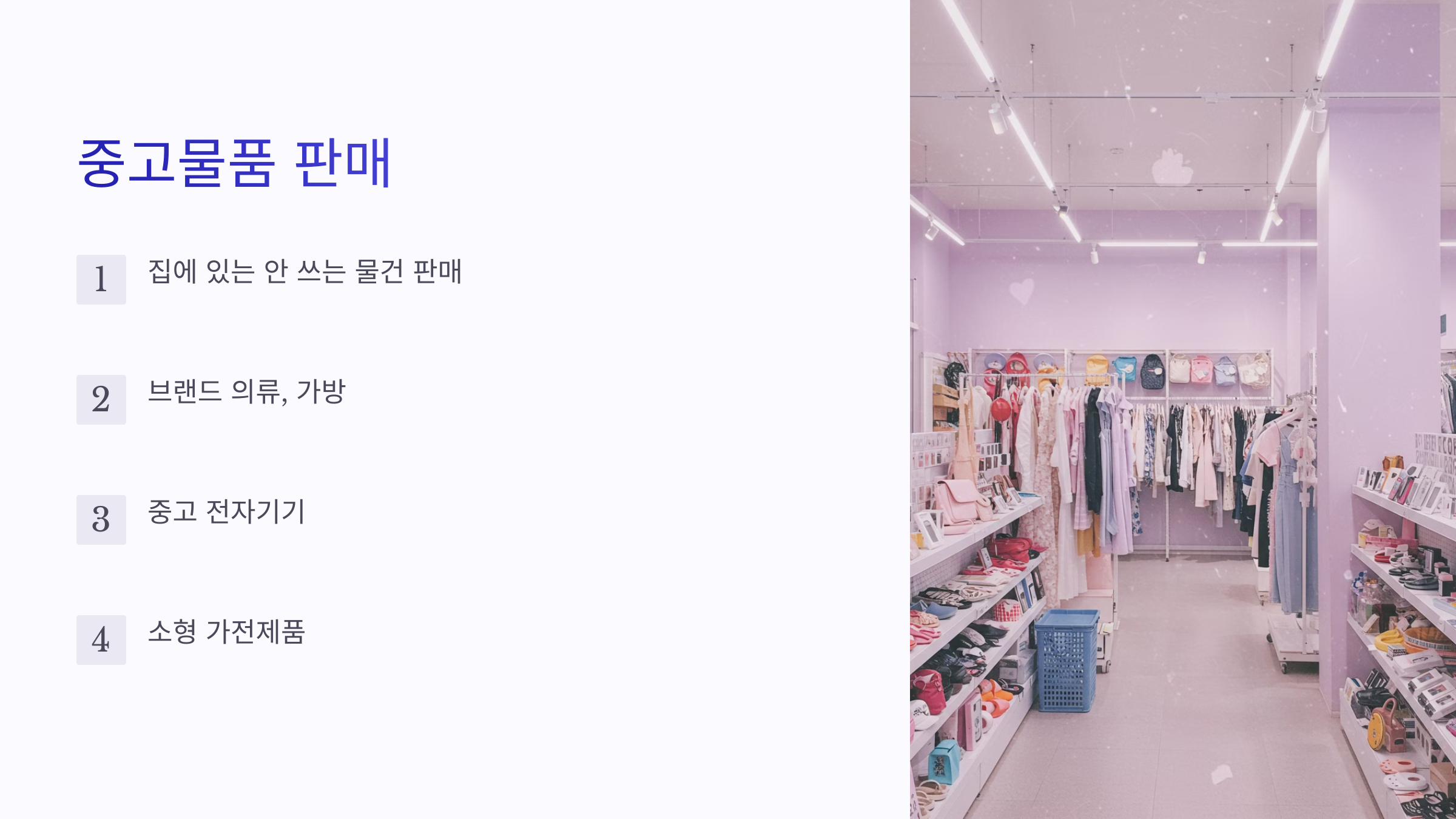 - 초기 비용이 거의 없다 : 사용하지 않는 물건을 판매하면서 시작할 수 있어 부담이 적어요.